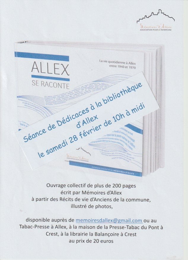 Une séance « Dédicaces » est prévue le samedi 28 février à la bibliothèque d’Allex de 10h à midi. On espère que beaucoup d’Allexois viendront nous rencontrer.